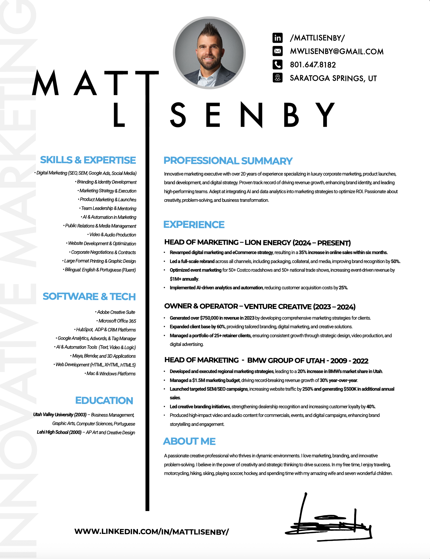 I love challenges and things that make me think and work harder. I always strive to better myself in whatever I do. My goal is to utilize my skills and talents to help those around me in the most effective way possible, both in business and personal life. I enjoy working with others and helping them expand and grow in the world of business. I love adventure, being outside, traveling, riding motorcycles, hiking, camping, skiing, soccer, hockey and hanging out with my awesome family, my wife and 7 super cute kids!